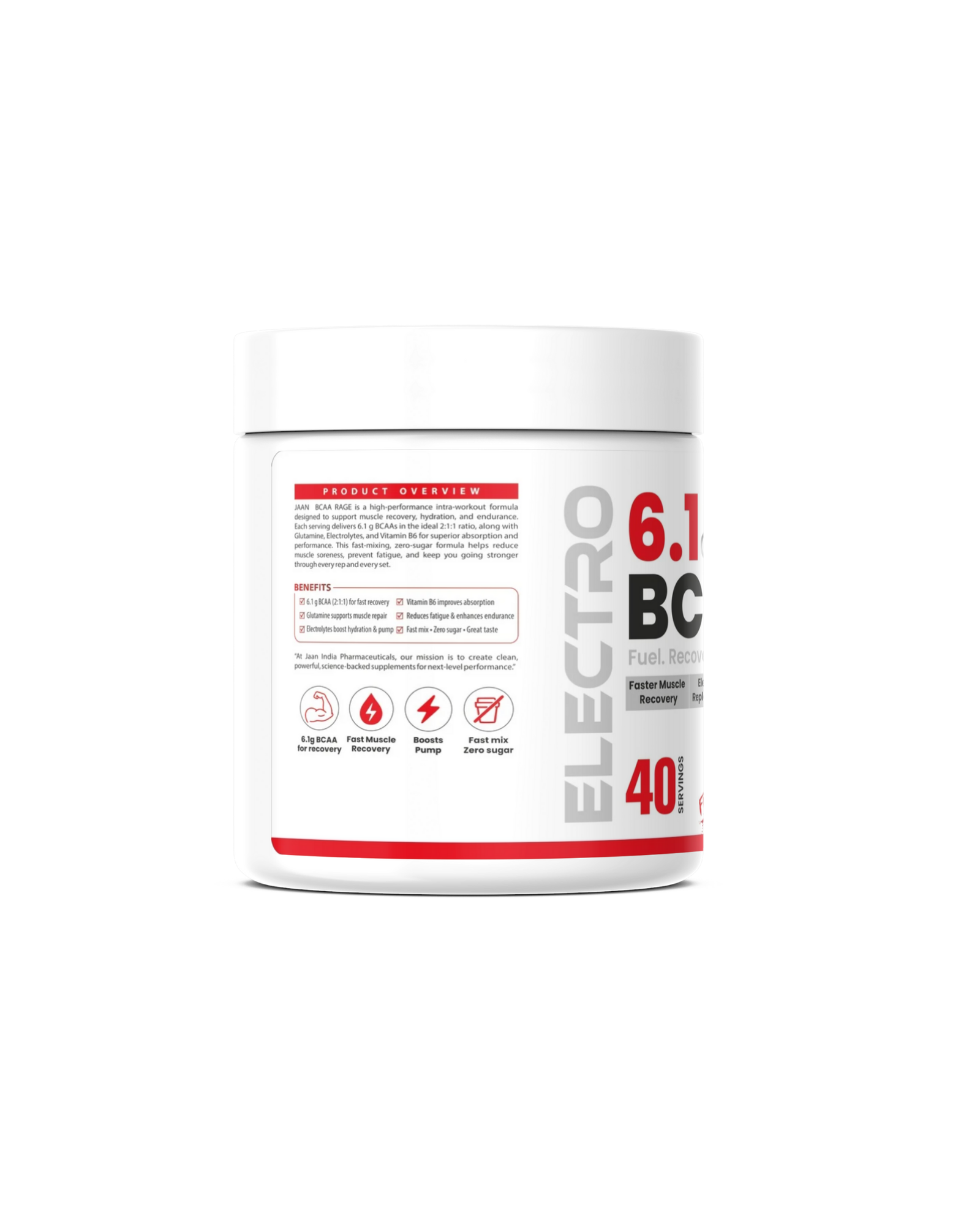 JAAN ELECTRO BCAA is a performance-focused blend of essential branched-chain amino acids (BCAAs) combined with electrolytes to support hydration and muscle recovery during workouts. It is ideal for athletes and fitness enthusiasts who train hard and need sustained endurance and faster recovery.